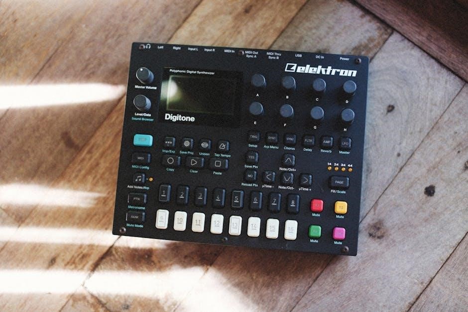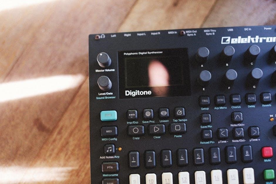 The Digitone’s responsiveness is immediate, allowing for real-time adjustments. The manual highlights the importance of saving your work frequently to avoid losing progress. Familiarizing yourself with these fundamental operations will unlock the Digitone’s full potential.